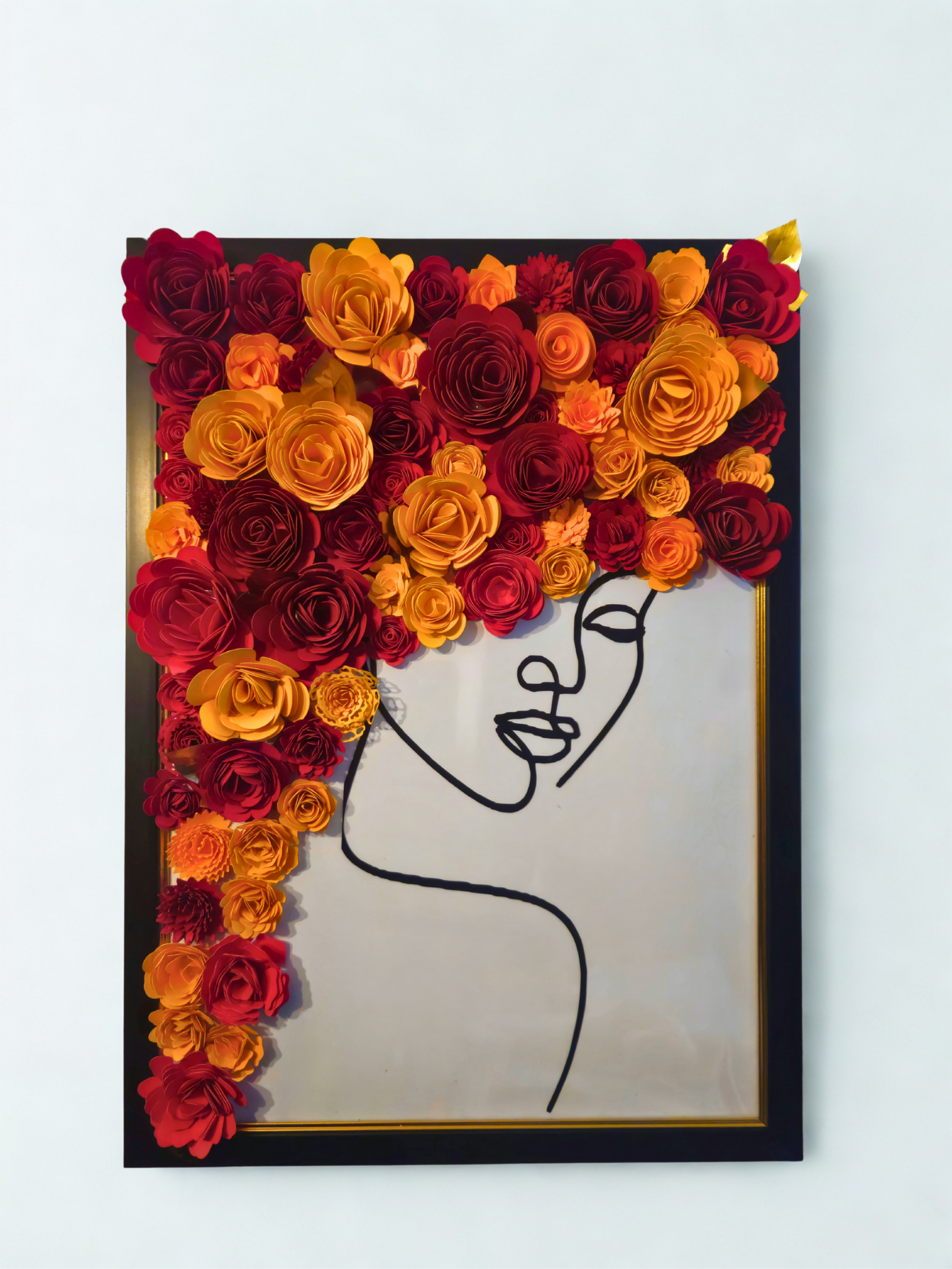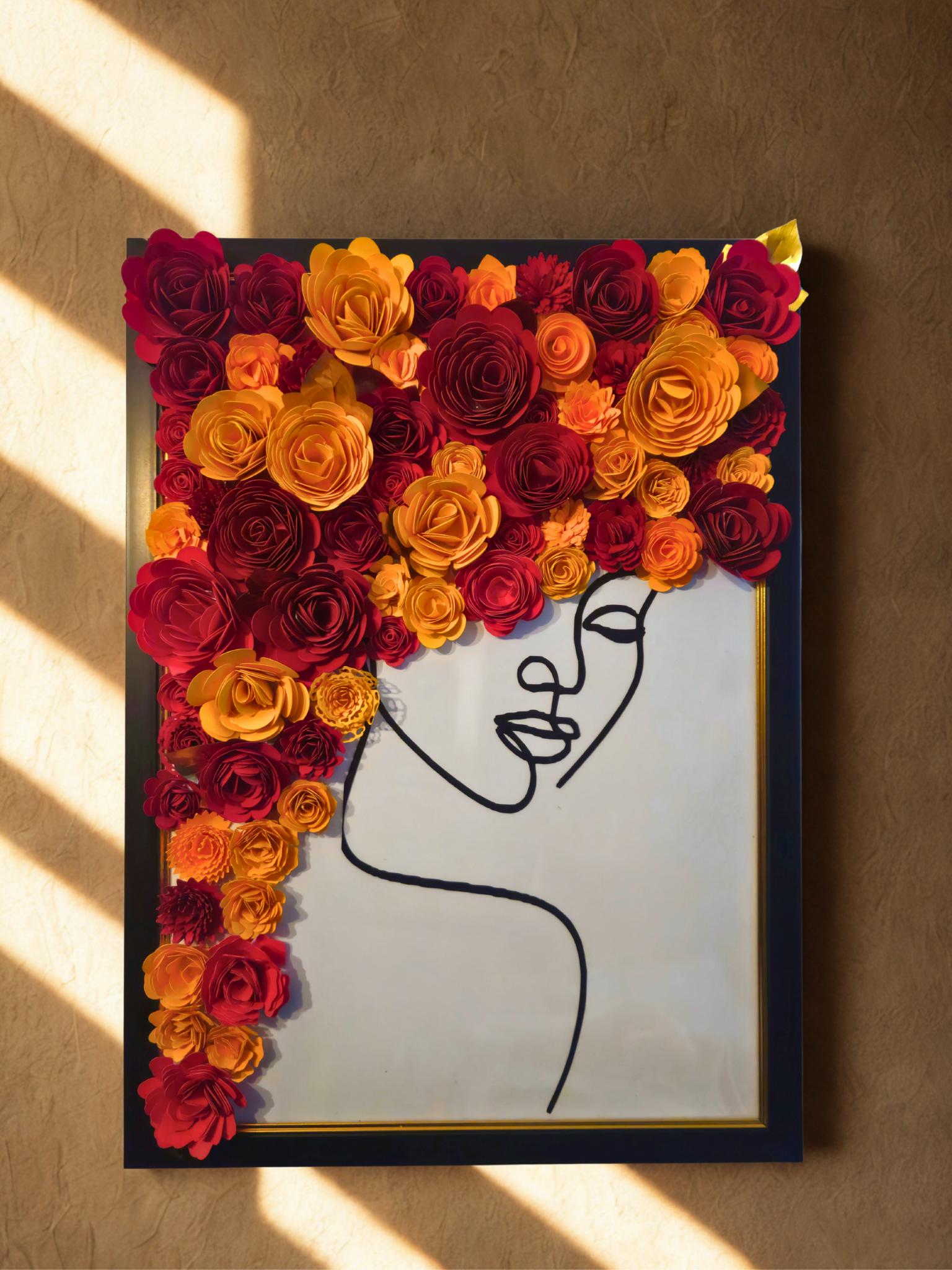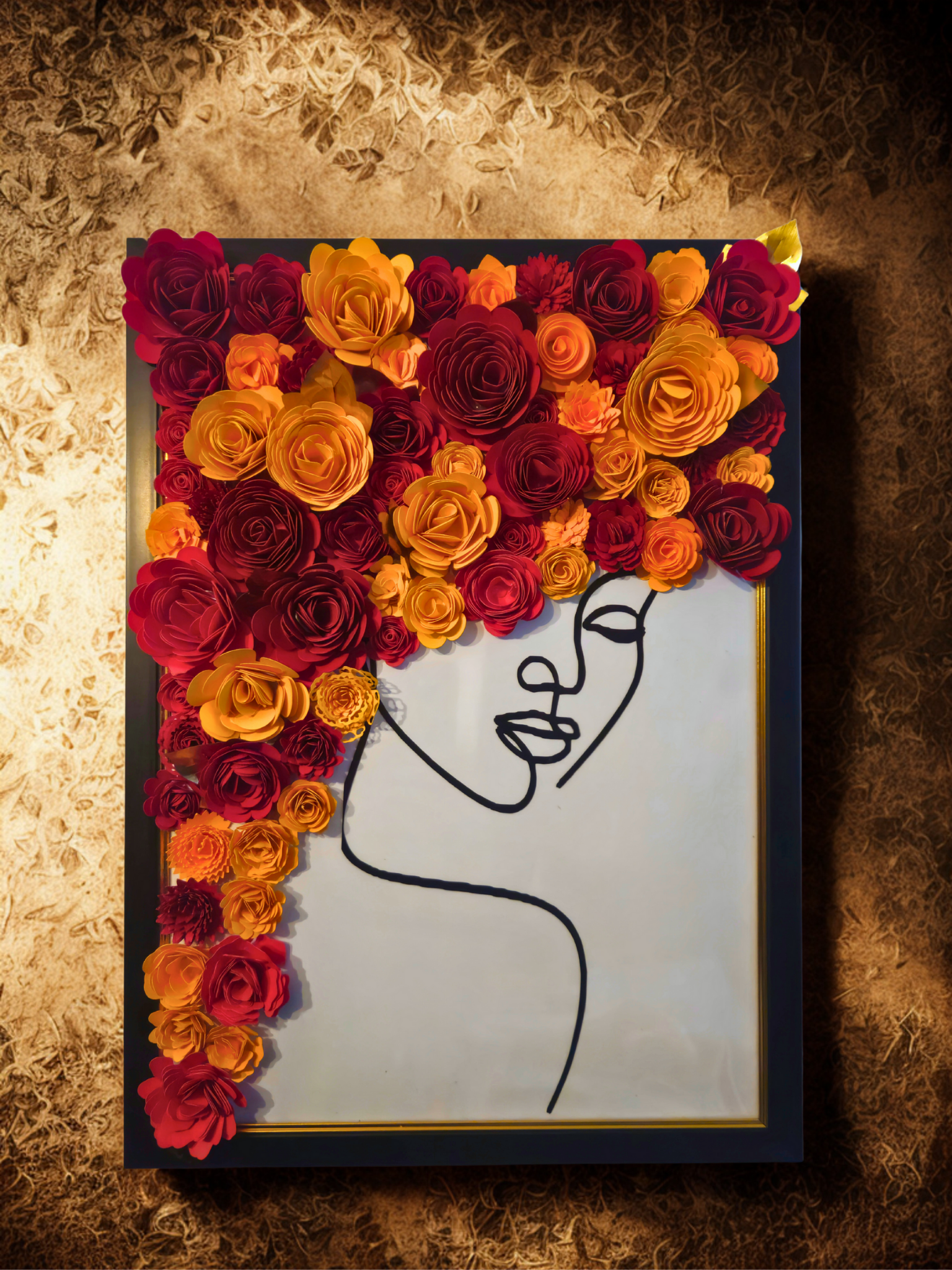 Transformă-ți spațiul într-o poveste! Acest tablou realizat manual, în format A3 (30x42 cm), combină eleganța unui portret minimalist cu delicatețea florilor din hârtie 3D, realizate individual cu migală și pasiune.