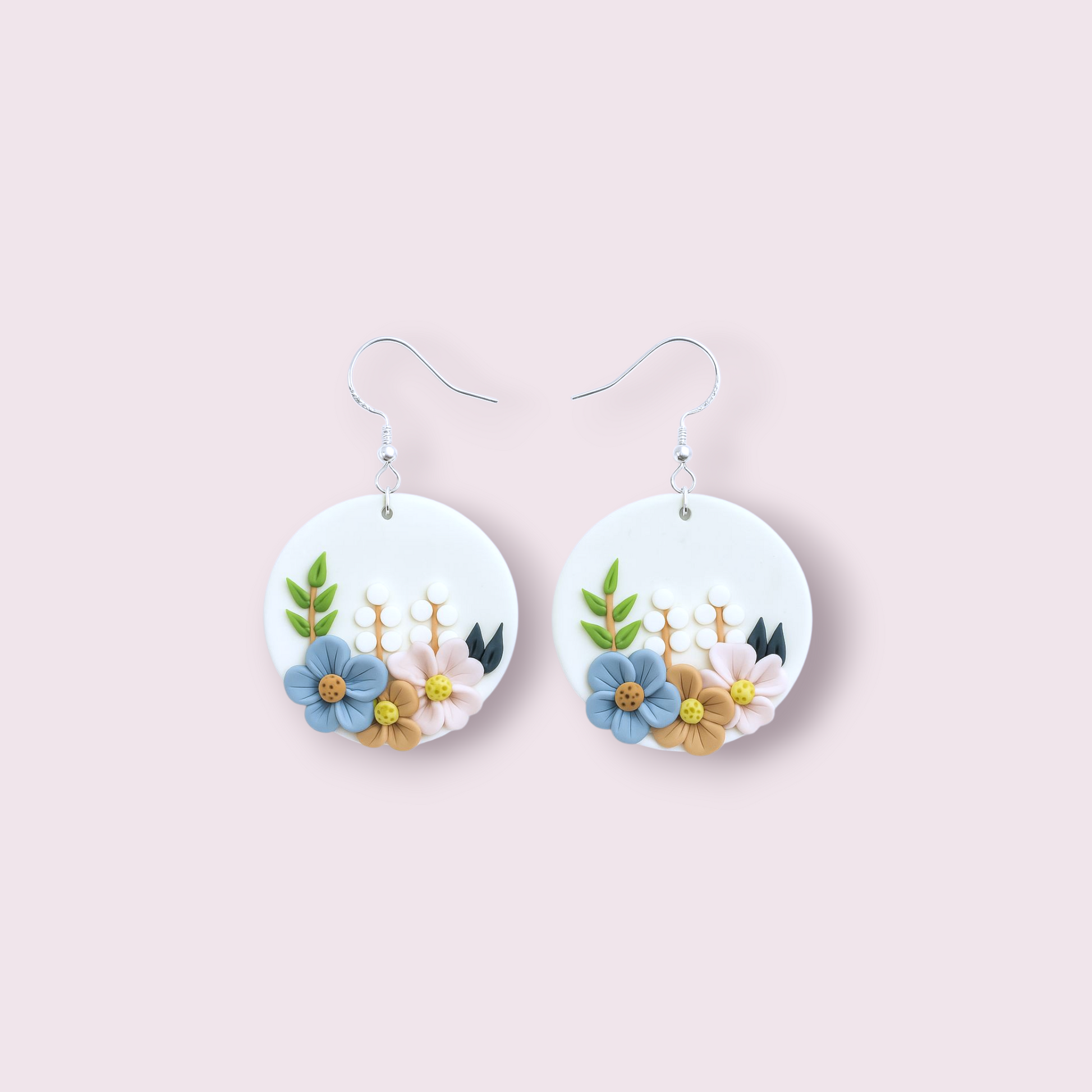 Cercei realizați manual din lut polimeric, ușori și eleganți, inspirați de frumusețea naturii. Detalii fine în forme de flori, cu prindere argint S925. Perfecți pentru orice ocazie.